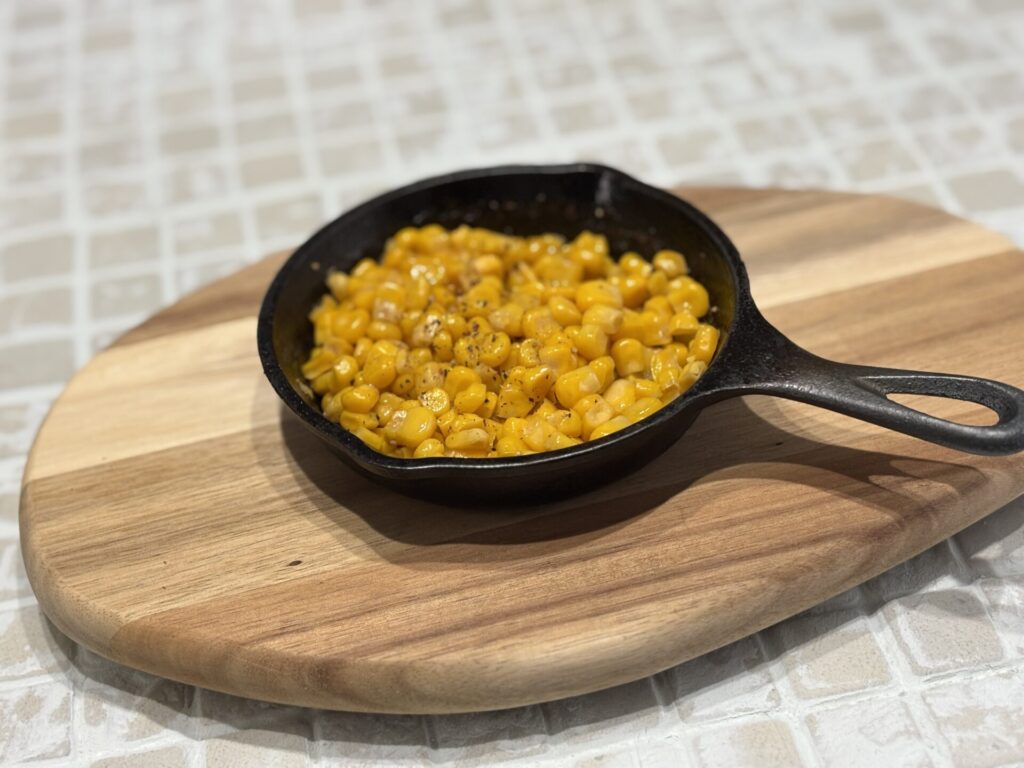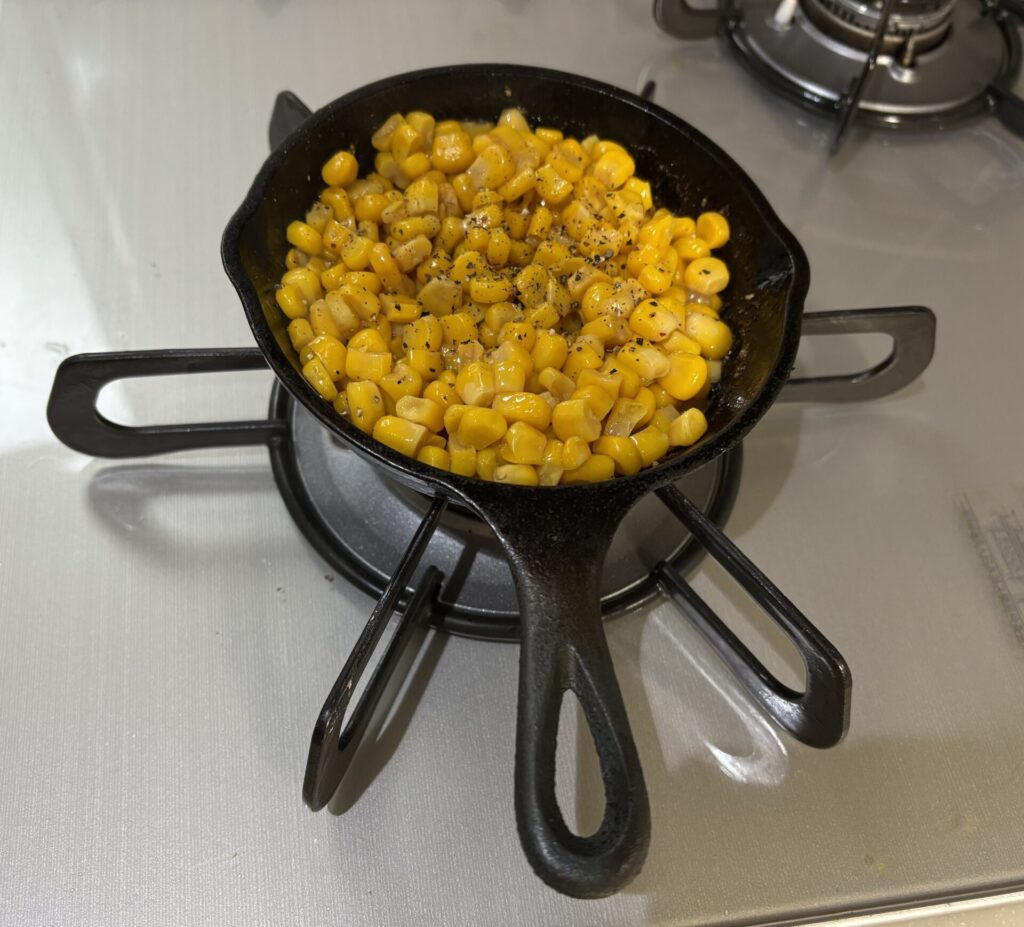娘が大好きなコーンバターレシピを紹介します。ホットプレートで焼き肉をする際は、必ず登場する我が家のコーンバター!スキレットなので具材ををのせてホットプレートにのせれば簡単に出来ます。ホットプレートもバターで汚れません。隣でほかの具材を焼いて食べてれば出来上がります!!とても有難い『スキレット』です!!キャンプ、アウトドア、自宅で重宝してます!
