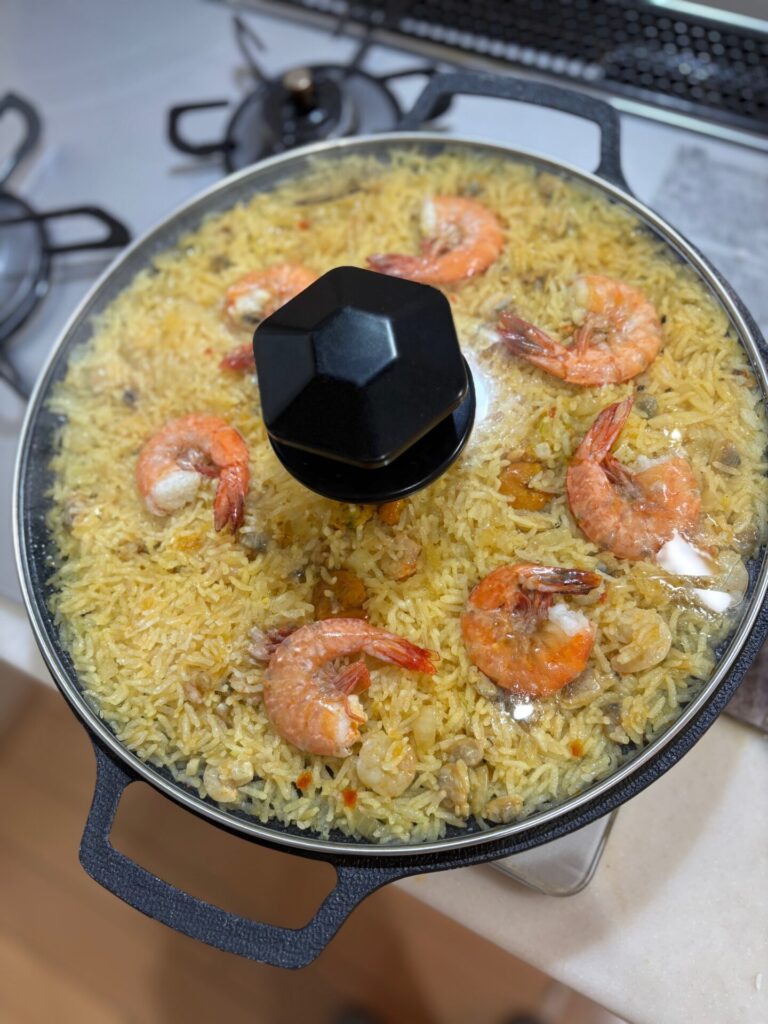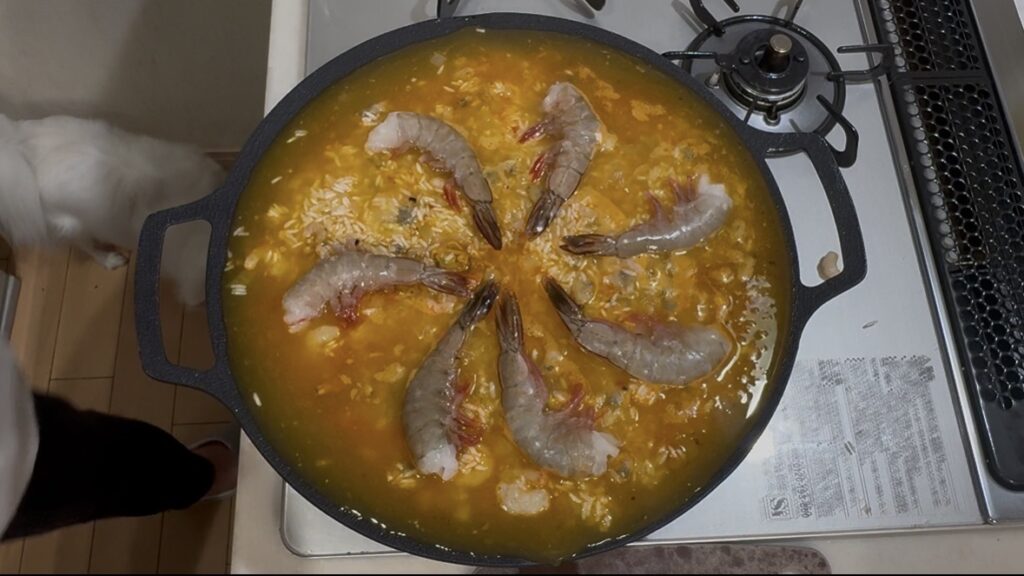 - パエリアの素を入れ、海老を入れ、ふたをして強火で煮ます。