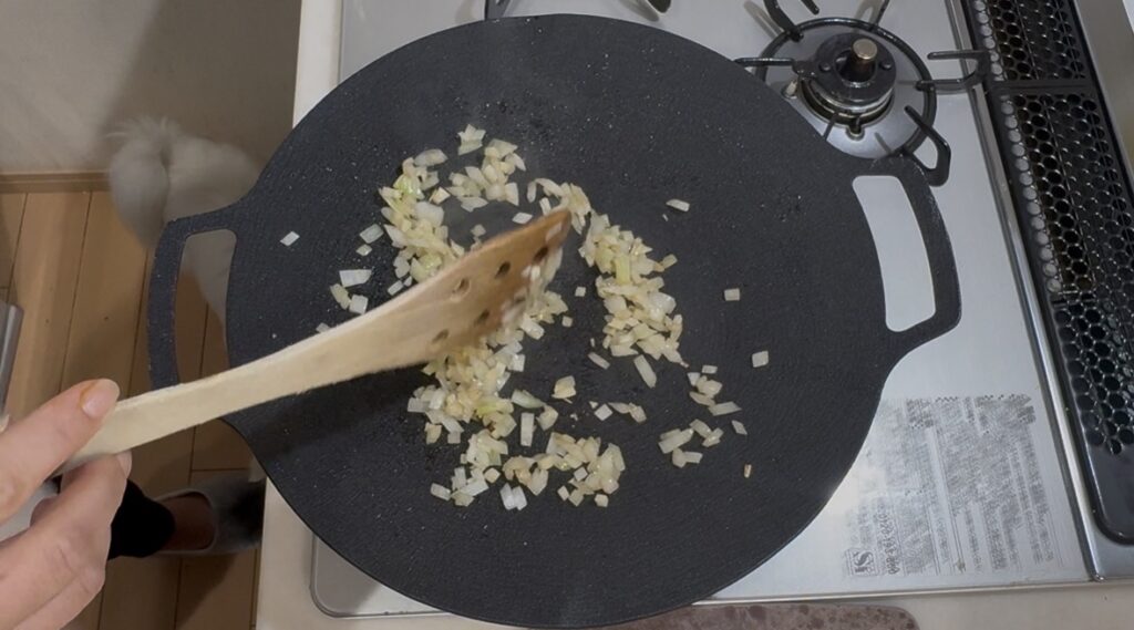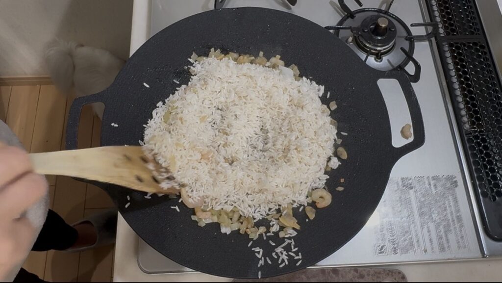 - 玉葱がしんなりしてきたら、お米を入れて2~3分炒めます。
